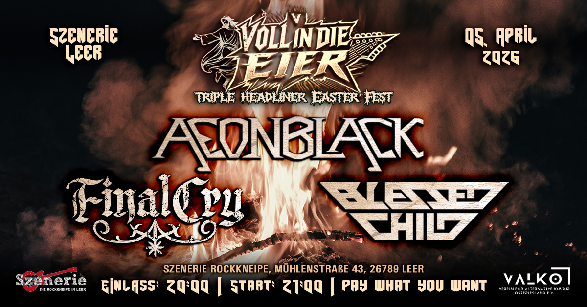 Am Ostersonntag, 5. April 2026 laden der ValKO e. V. und die Rockkneipe Szenerie wieder zu einem Metal-Event der Extraklasse. Die metallische Ostersause unter dem Motto „Voll in die Eier“ findet bereits zum fünften Mal in der kultigen Szenekneipe statt und hat sich damit zu einer festen Tradition für die ostfriesische Headbangerschaft entwickelt. Ebenso traditionell gibt sich zu diesem Anlass das Melodic Thrash Metal-Quintett FINAL CRY aus dem Weserbergland die Ehre, das bereits zum vierten Mal in seiner jüngeren Geschichte in der Ledastadt Station macht. Bei den süddeutschen Heavy Metallern AEONBLACK und den Braunschweiger Thrashern von BLESSED CHILD hingegen handelt es sich um waschechte Debütanten in der Kreisstadt, die es aber ebenso anständig krachen lassen werden.