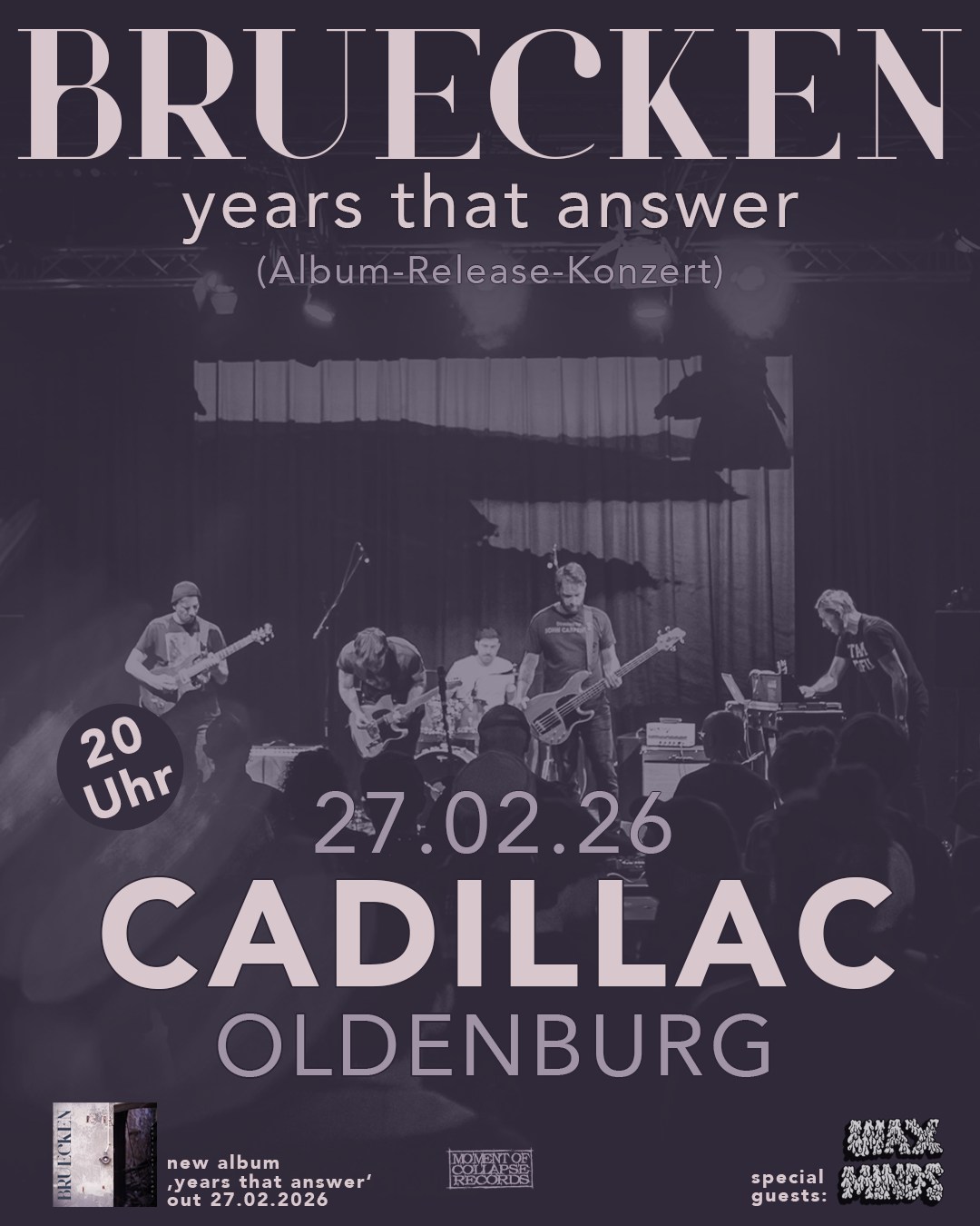 Die in Oldenburg gegründet und inzwischen ganz Norddeutschland verteilte lebende Instrumental-Band BRUECKEN hat sich mit zwei Alben, zuletzt „INNERE UNRUHEN“ vom März 2022 und mit Konzerten in ganz Deutschland ihren eigenen, Platz in der wachsenden Szene erspielt. Einfühlsam und durchdacht schaffen BRUECKEN einen vielseitigen und unverwechselbaren Sound, der seine Inspiration aus allen Genres atmosphärischer und härterer Gitarrenmusik zieht.