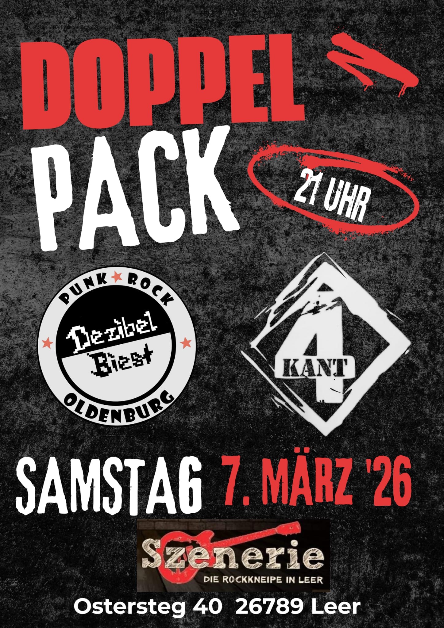 Am Samstag, 07. März 2026, gibt es in der Szenerie einen energiegeladenen Doppelpack aus Punk- und Rockmusik. Die Veranstaltung versteht sich als subkulturelle Alternative und Ergänzung zu „Leer Live“, dem Leeraner Kneipenfestival.