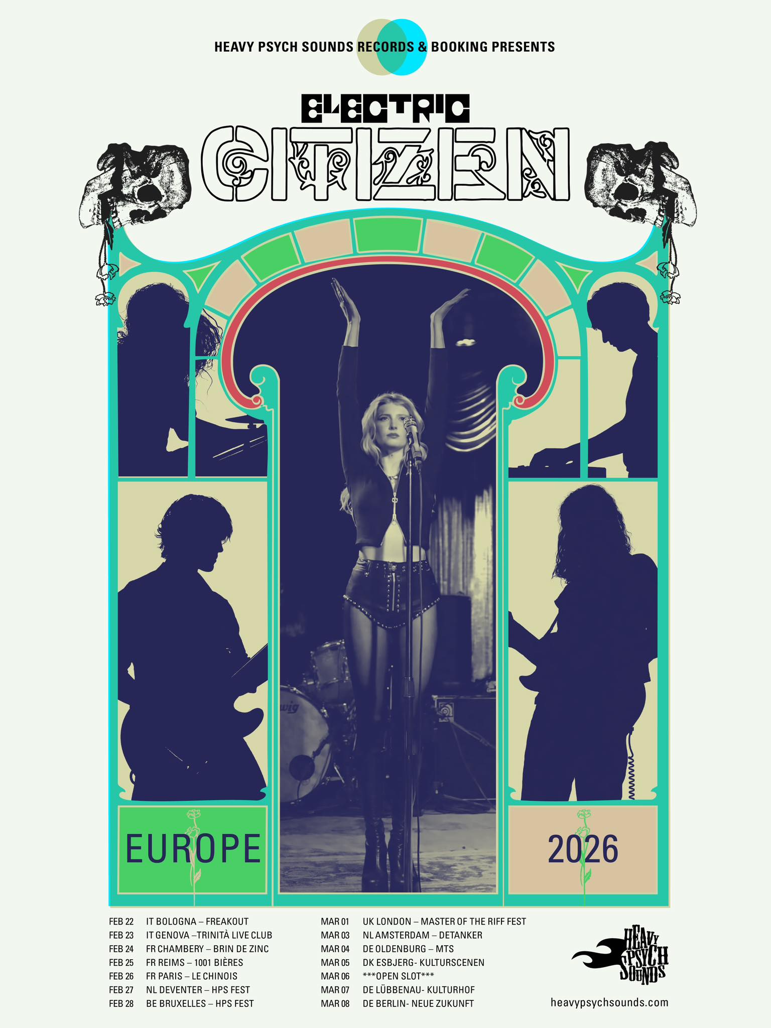 Electric Citizen – die Band aus Cincinnati, USA, bringt ihren einzigartigen Mix aus dunklem Psychedelic Rock, Heavy Blues und hypnotischem Garage-Sound nach Oldenburg! Ihre Musik ist eine Zeitreise in die 70er, angereichert mit modernen Einflüssen: fette Riffs, treibende Basslines, orgelartige Keyboards und die markante, rauchige Stimme von Sänger Laura Dolan. Fans von Bands wie Black Sabbath, Blue Öyster Cult oder The Black Angels werden hier voll auf ihre Kosten kommen.