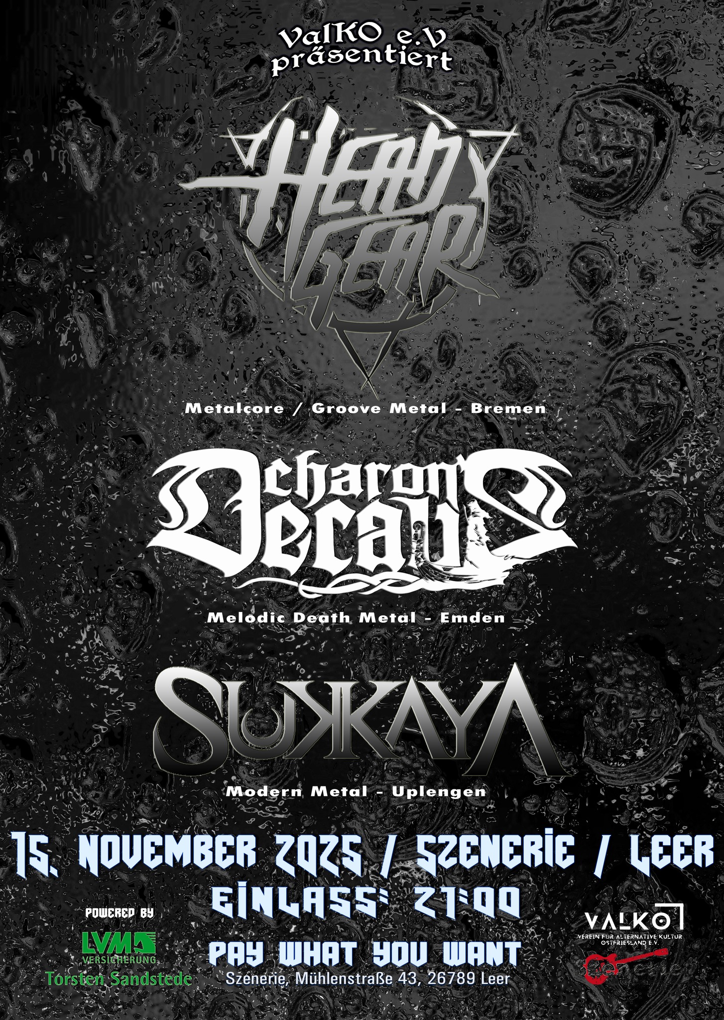 Am 15. November 2025 gibt es in der „Szenerie – Die Rockkneipe in Leer“ ein letztes Konzert des Vereins Valko e.V. vor der Winterpause bis Februar 2026. Der Abend steht (nicht) ganz im Zeichen des Modern und Groove Metals. Um 22:00 Uhr werden die Loakalmatadoren von SUKKAYA aus Uplengen mit melodischen Metal und einer Mischung aus cleanem Gesang und Screams, druckvollem Sound und einer energiegeladenen Live-Performance den Reigen eröffnen. Danach werden CHARON’S DECAY aus Emden ihren Melodic Death Metal zu Gehör bringen. Inspiriert vom Death Metal aus Göteborg und Stockholm kreieren Charon’s Decay einen einzigartigen Sound aus einer Mischung aus Oldschool und modernem melodischen Death Metal.