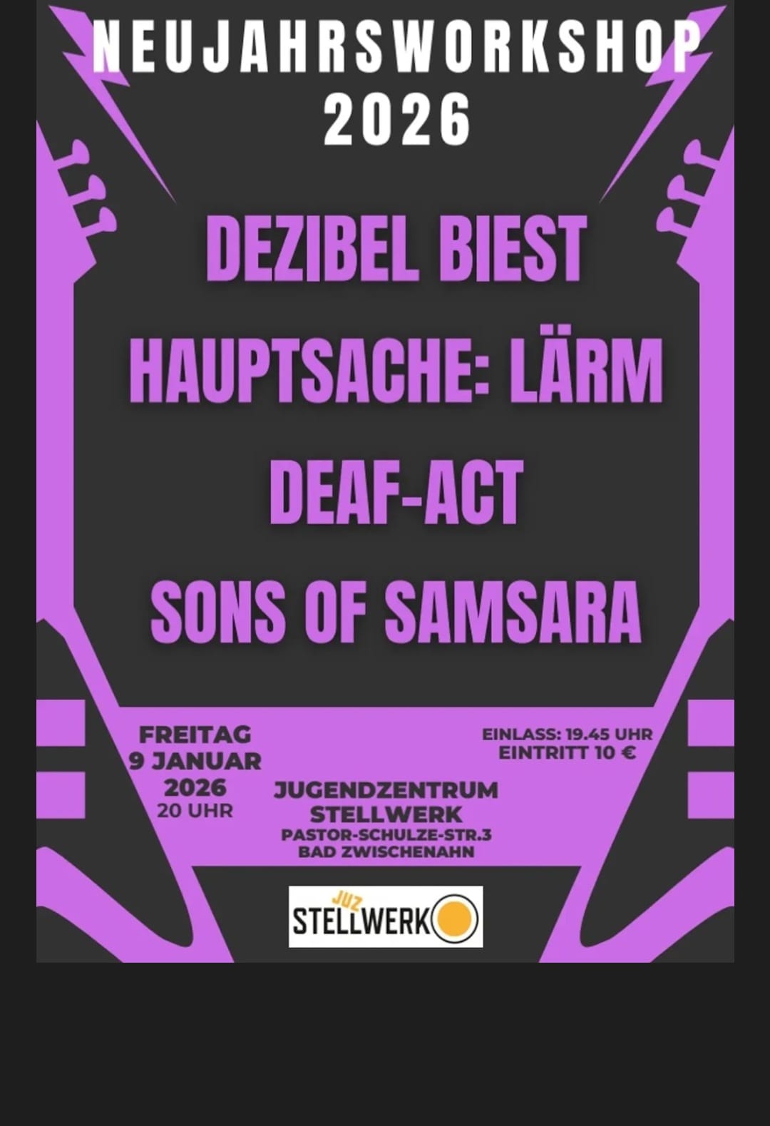 Neujahrsworkshop 2026 am Freitag, 09.01.2026, findet der NEUJAHRSWORKSHOP 2026 im Jugendzentrum Stellwerk in Bad Zwischenahn statt. Vier Bands, viel Lärm und noch mehr Herz. Mit dabei: – Deaf-Act – Dezibel Beast – Hauptsache: Lärm – Sons Of Samsara + Zu Google Kalender hinzufügen + iCal / Outlook export 00 Tage 00 Stunden 00 Minuten 00 Sekunden Schlagwörter: Alternative, Club-Konzert, Rock Datum Jan. 09 2026 Uhrzeit 19:45 Kosten 10 € Mehr Info zum Veranstalter Veranstaltungsort JUZ Stellwerk Stellwerk, Pastor-Schulze-Str. 3, Bad Zwischenahn Website https://www.jz-stellwerk.de/jugendzentrum-stellwerk/ Kategorie Alternative Club-Konzert Grunge Rock zum Veranstalter Teile diese Veranstaltung