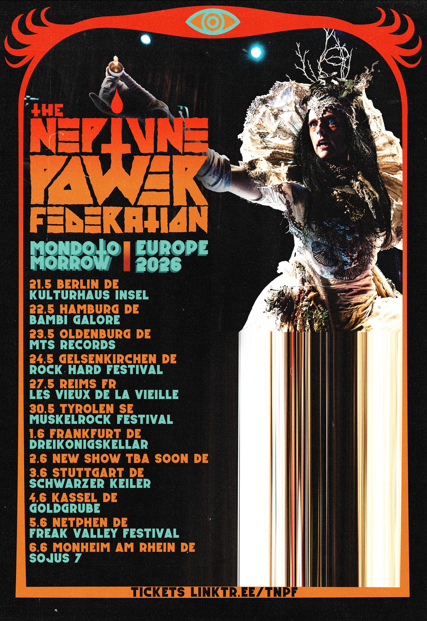 Am 23. Mai 2026 landet die australische Kosmische Rock-Explosion THE NEPTUNE POWER FEDERATION mit ihrer „Mondo Tomorrow European Tour“ wieder in Oldenburg – bereits zum dritten Mal! Die Band um den charismatischen Frontmann Screamin’ Lord Sutch (II) feiert ihr brandneues Album „Mondo Tomorrow“ – und verspricht eine Show, die euch direkt ins Weltall katapultiert!