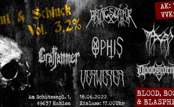 Nach zweijähriger Zwangspause findet nun endlich die dritte Auflage des Blut & Schluck Festivals statt! Am Schützenplatz 1, 49637 Menslage/Hahlen Camp: 15:00 Uhr Doors: 17:00 Uhr Bands: 18:00 Uhr VVK: 10,- AK: 15,- – Bands – Drengskapur (Black Metal – Berlin) Naxen (Black Metal – Münster) Ophis (Death/Doom Metal – […]
