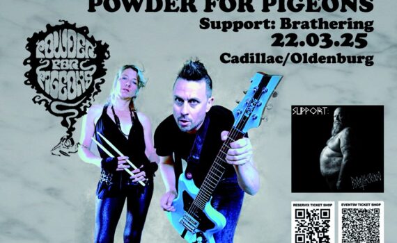 Powder for Pigeons (Power Rock Duo aus Perth/Hamburg) – Sänger und Gitarrist Rhys und Schlagzeugerin Meike eilt der Ruf einer schonungslos energischen und schweisstreibenden Wall-of-Rock-Performance voraus. Zuletzt auf Tour mit Monster Magnet, Clawfinger und Life of Agony begeistert das Power-Duo und in Las Vegas verheiratete Ehepaar mit einem nahezu magischen Zusammenspiel […]