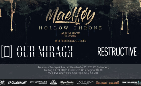 MAELFøY (Melodic Post-Hardcore band aus Ganderkesee) veröffentlichen ihr Debut-Album „Hollow Throne“ im Amadeus in Oldenburg! Mit dabei sind OUR MIRAGE (Post-/Metalcore) und RESTRUCTIVE (Metalcore aus Oldenburg). Der Termin sollte ursprünglich im Dezember 2021 stattfinden.